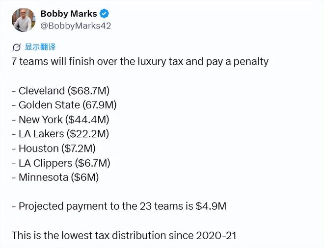 2024-25赛季,共有10支球队缴税,总罚金4.612亿美元,20支非缴税球队每队分到约1150万美元。据马克斯统计,本赛季预计的490万美元分红,是2020-21赛季以来的最低值。
