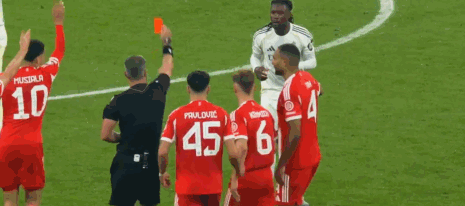 欧冠1/4决赛次回合,皇马客场对阵拜仁,卡马文加在第87分钟累计两张黄牌被罚下。
