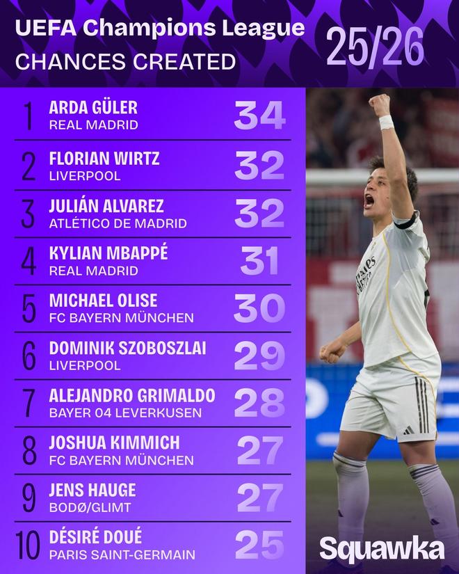 数据机构Squawka列出本赛季欧冠截至目前创造机会榜,居莱尔34次居首,维尔茨、阿尔瓦雷斯32次并列第二。