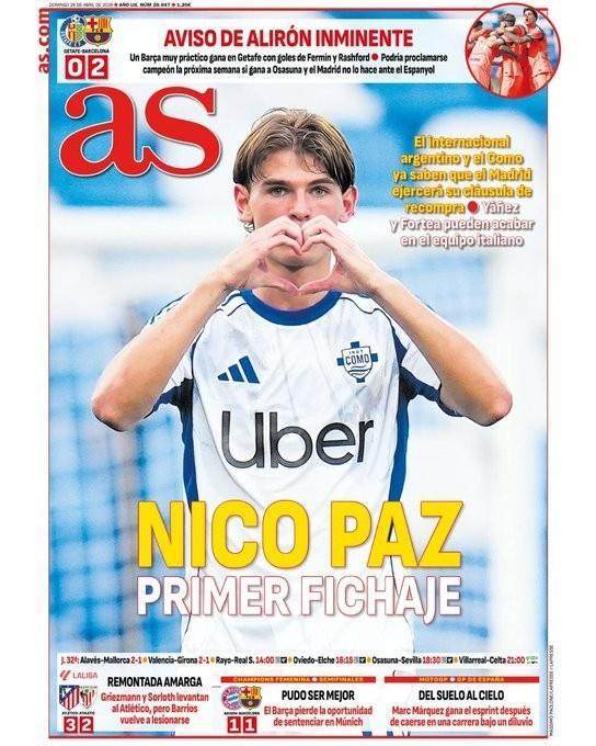本周日,《阿斯》报以头版头条形式预告阿根廷中场天才尼科·帕斯回归皇家马德里的可能。据悉,皇马方面已决定激活体育城青训出身的帕斯回购条款,而在科莫练级有成的帕斯,似乎终于等到了伯纳乌的垂青之日。