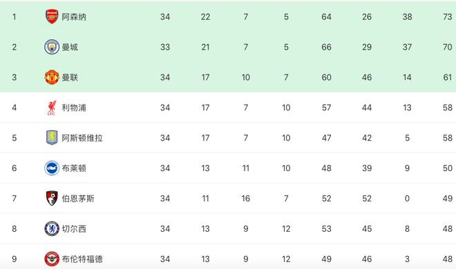 第4名的利物浦和第5名的维拉同积58分,领先第6名布莱顿8分。只要最后4轮不崩盘,大概率也能在下赛季进军欧冠赛场。