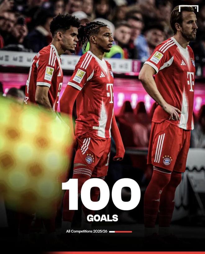 由凯恩、奥利塞和路易斯·迪亚斯组成的三叉戟,本赛季各项赛事总进球数已突破100大关。这也是欧冠历史上首次出现同一支球队有三名球员单赛季欧冠参与进球均达10个以上。