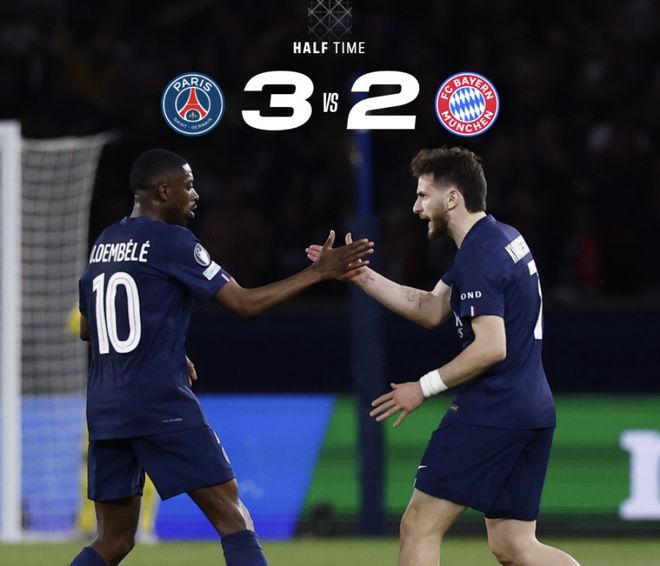 拜仁的奥利塞随后用一记连过数人的劲射将比分追至2-2,然而上半场补时阶段,阿方索·戴维斯被判禁区内手球,登贝莱顶住压力操刀命中,帮助大巴黎在半场结束时取得3-2的领先。