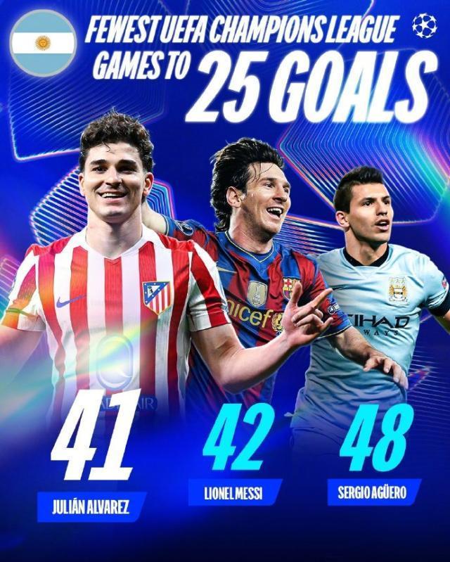 【25】阿尔瓦雷斯个人第41次欧冠出场打进25球。是南美球员在欧冠达到这一进球数场次最少的,打破了梅西42场的纪录。