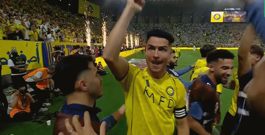 这是41岁的C罗,生涯第970球,距离1000球大关仅剩30球。进球后,C罗与队友开心跳舞庆祝。