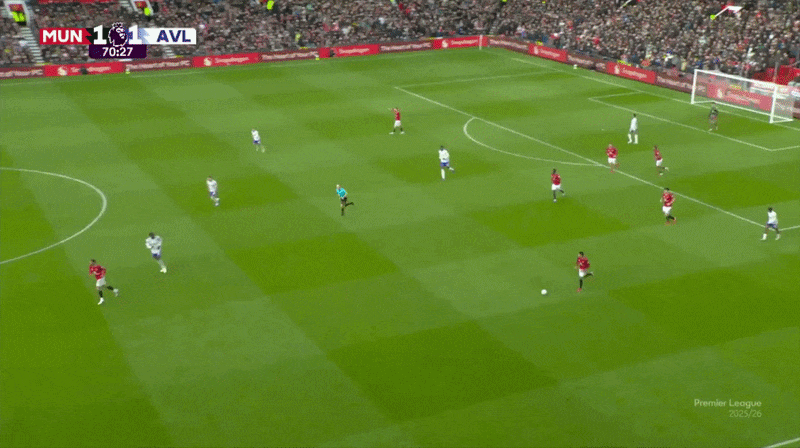 此处,库尼亚向内切,费尔南德斯向边线移动,曼联从右路进攻。随后阿马德重新组织攻势,暂时扮演起“10号位”(中路组织者)的角色,将姆伯莫换位到左侧。